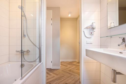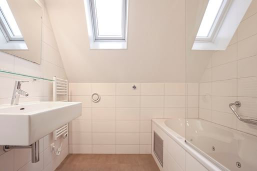 - Badezimmer mit Dusche in der Badewanne und Waschbecken auf der ersten Etage