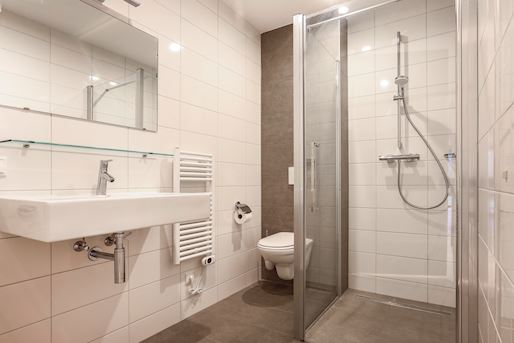 - Badezimmer mit ebenerdiger Dusche und Waschbecken im Erdgeschoss