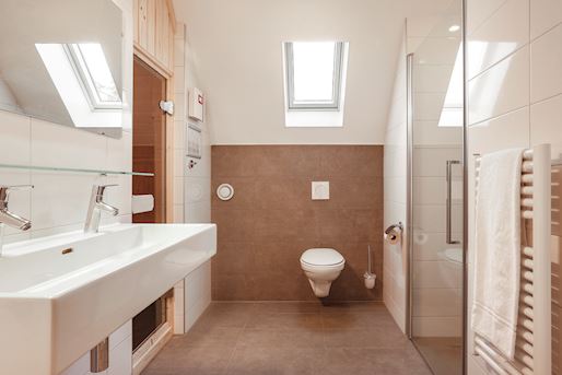- Badezimmer mit ebenerdiger Dusche, Waschbecken und WC auf der ersten Etage