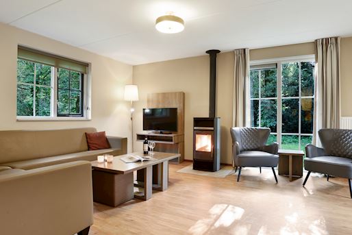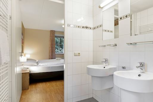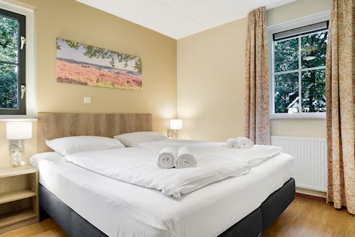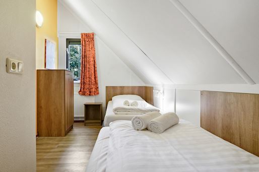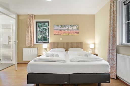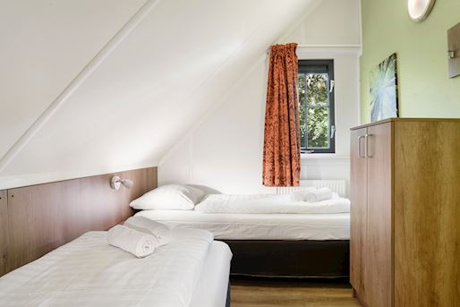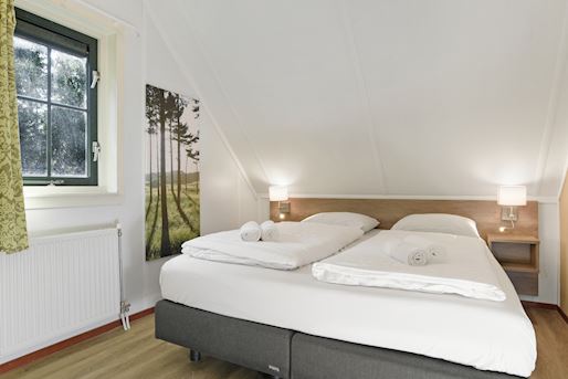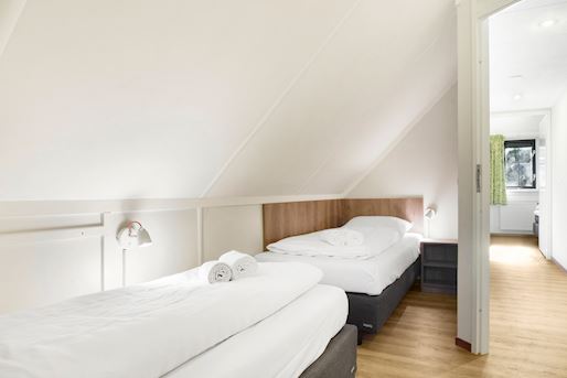 - Schlafzimmer mit zwei Auping Boxspring-Einzelbetten, 2-Personen Softtopper und Flatscreen-TV