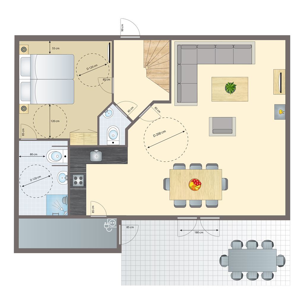 • Aufgrund der max. Türbreite von 75 cm ist dieses Ferienhaus nur für kleine Rollstühle zugänglich