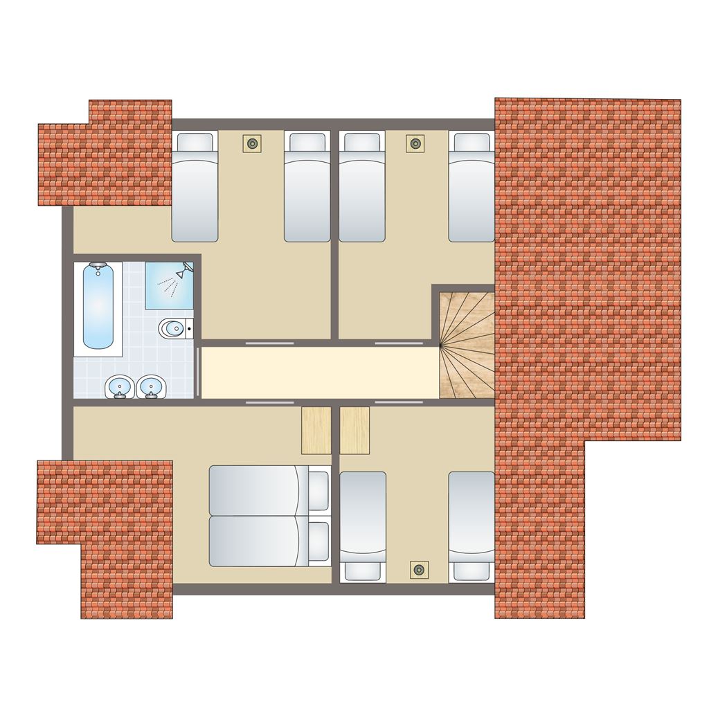 - Vier Schlafzimmer mit jeweils zwei Boxspring-Einzelbetten auf der ersten Etage