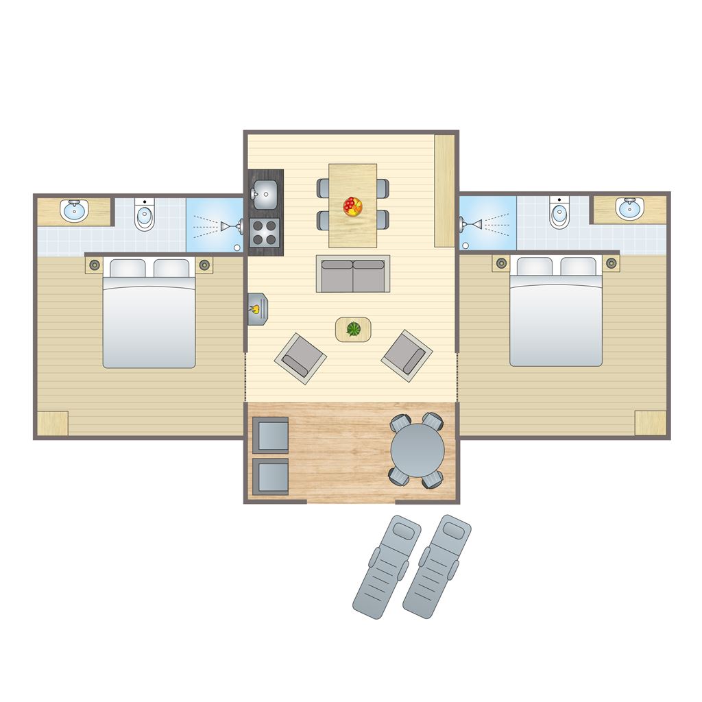 - Zwei Badezimmer (vom Schlafzimmer begehbar) mit Dusche und WC
