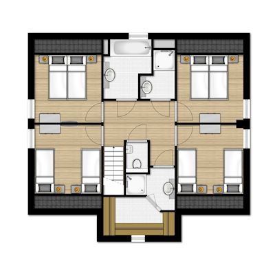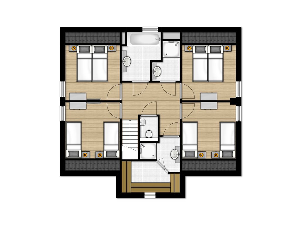 - Vier Schlafzimmer mit jeweils zwei Boxspring-Einzelbetten auf der ersten Etage