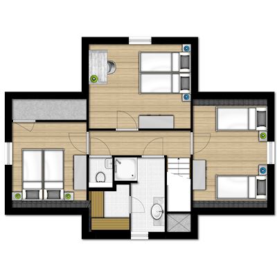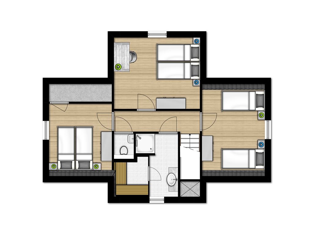 - Drei Schlafzimmer mit jeweils zwei Boxspring-Einzelbetten auf der ersten Etage