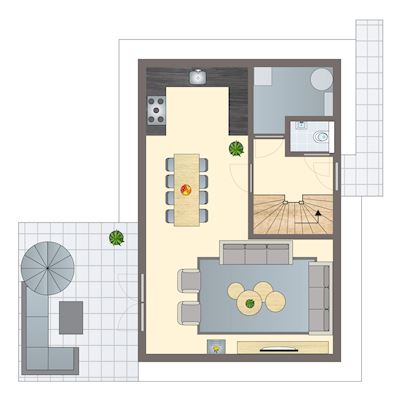 - Zwei Badezimmer (vom Schlafzimmer begehbar) mit jeweils ebenerdiger Dusche und WC auf der ersten Etage