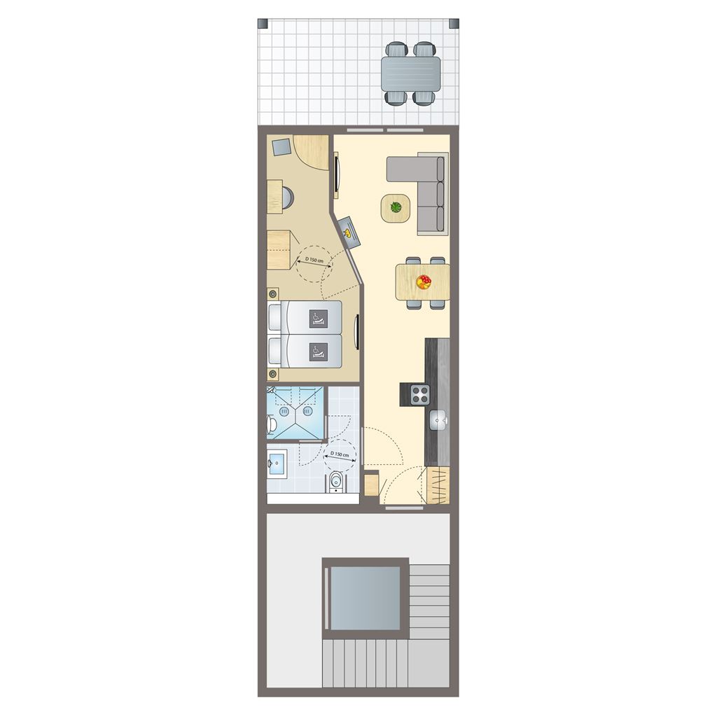 - Angepasstes Badezimmer mit ebenerdiger Doppelregen- und Dampfdusche, Duschsitz mit Armlehnen, Waschbecken mindestens 78 cm hoch und unterfahrbar und WC mit Bügeln