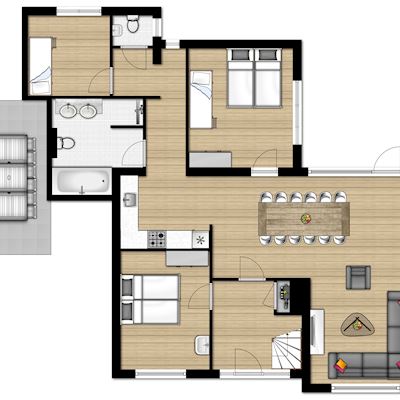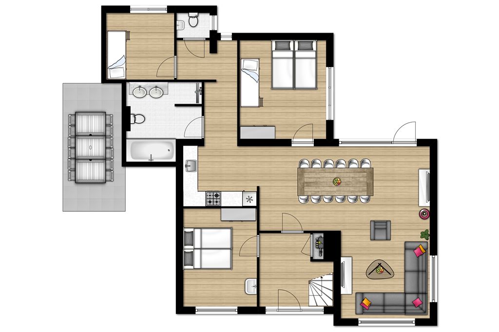 - Drei Schlafzimmer mit jeweils zwei Boxspring-Einzelbetten