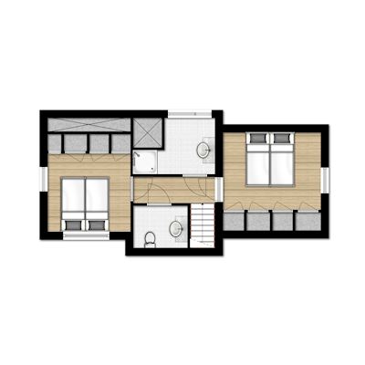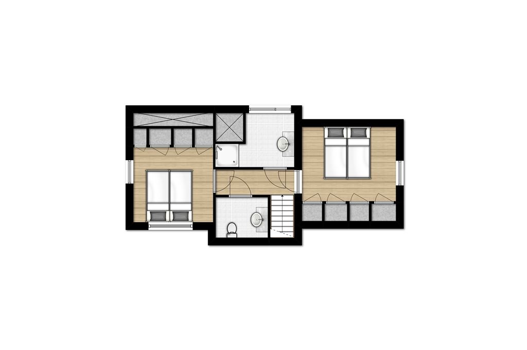 - Schlafzimmer mit zwei Boxspring-Einzelbetten und Etagenbett