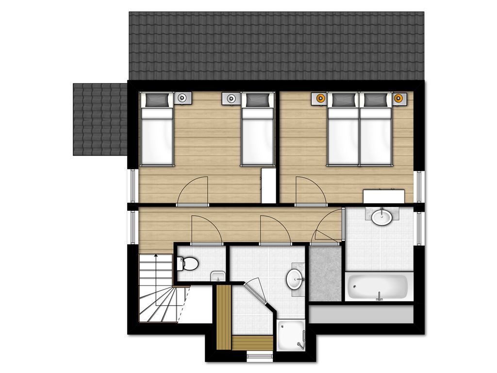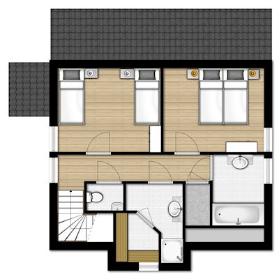 - Zwei Schlafzimmer mit jeweils zwei Boxspring-Einzelbetten auf der ersten Etage